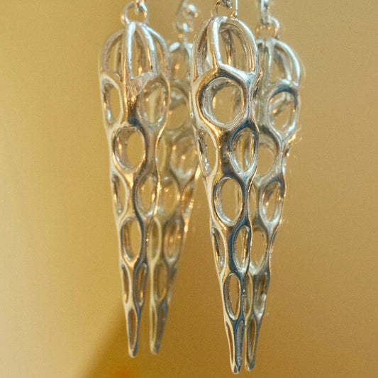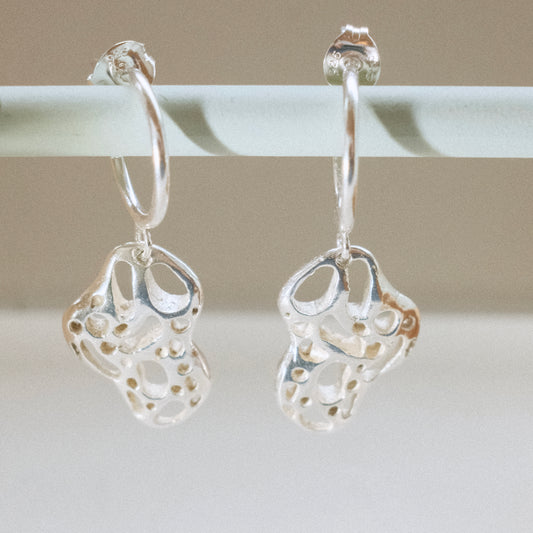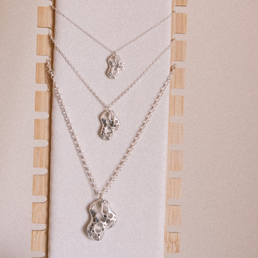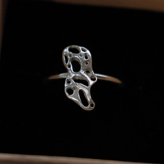 Inspired by Igneous rock formed through the cooling and solidification of lava. This collection utilises 3D print technology to aid the creation of these solid silver forms.