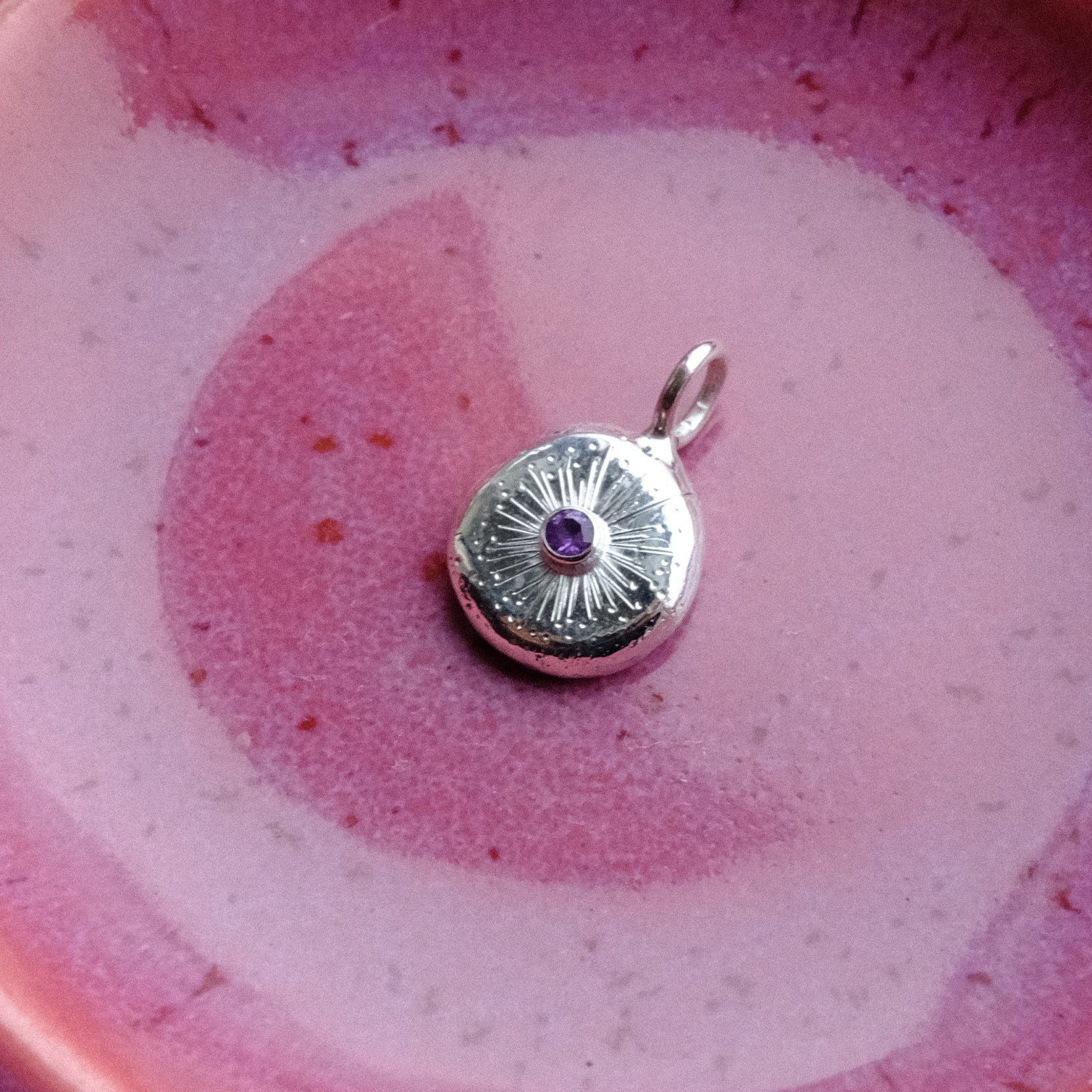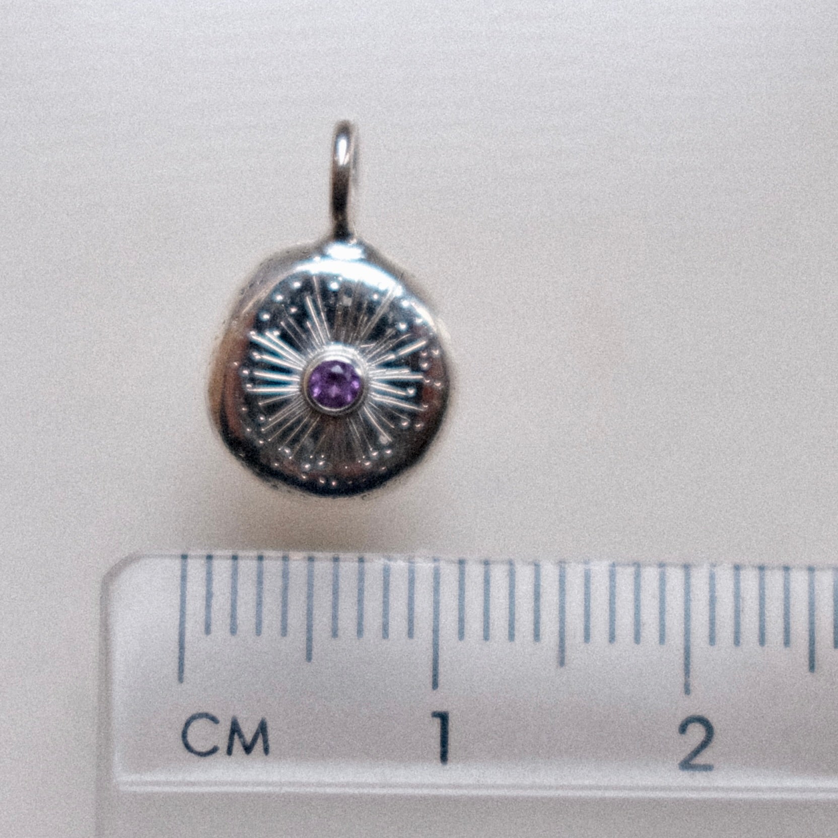 This handmade solid sterling silver pendant features a 2mm Amethyst and engraved starburst pattern.
