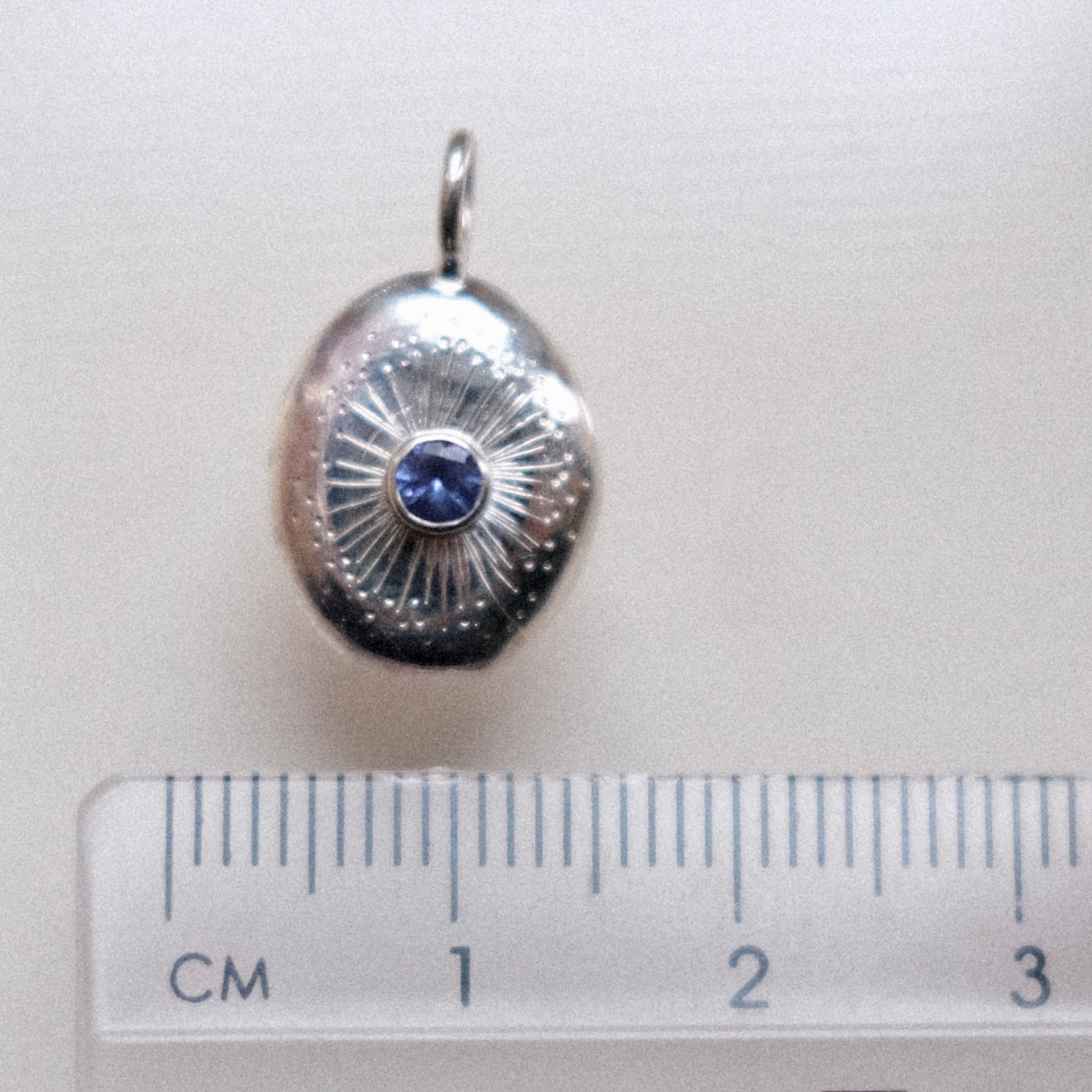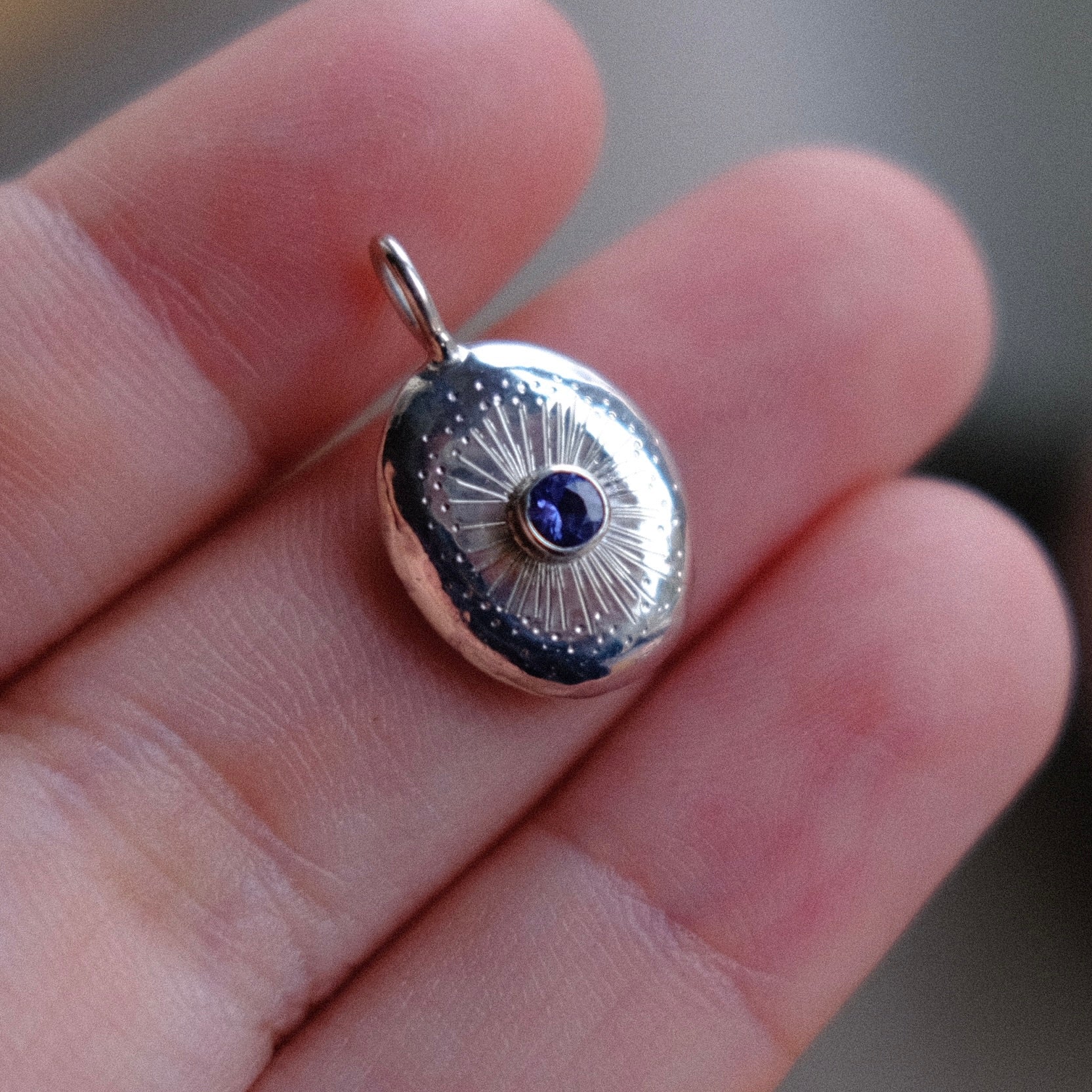 This handmade solid sterling silver pendant features a 3mm natural Sri-Lankan Sapphire and engraved starburst pattern.
