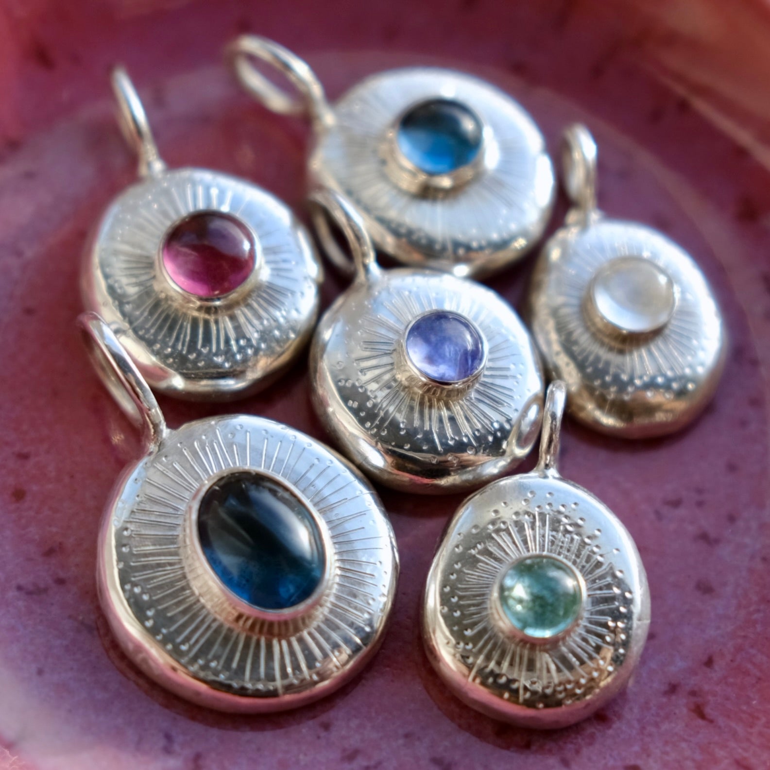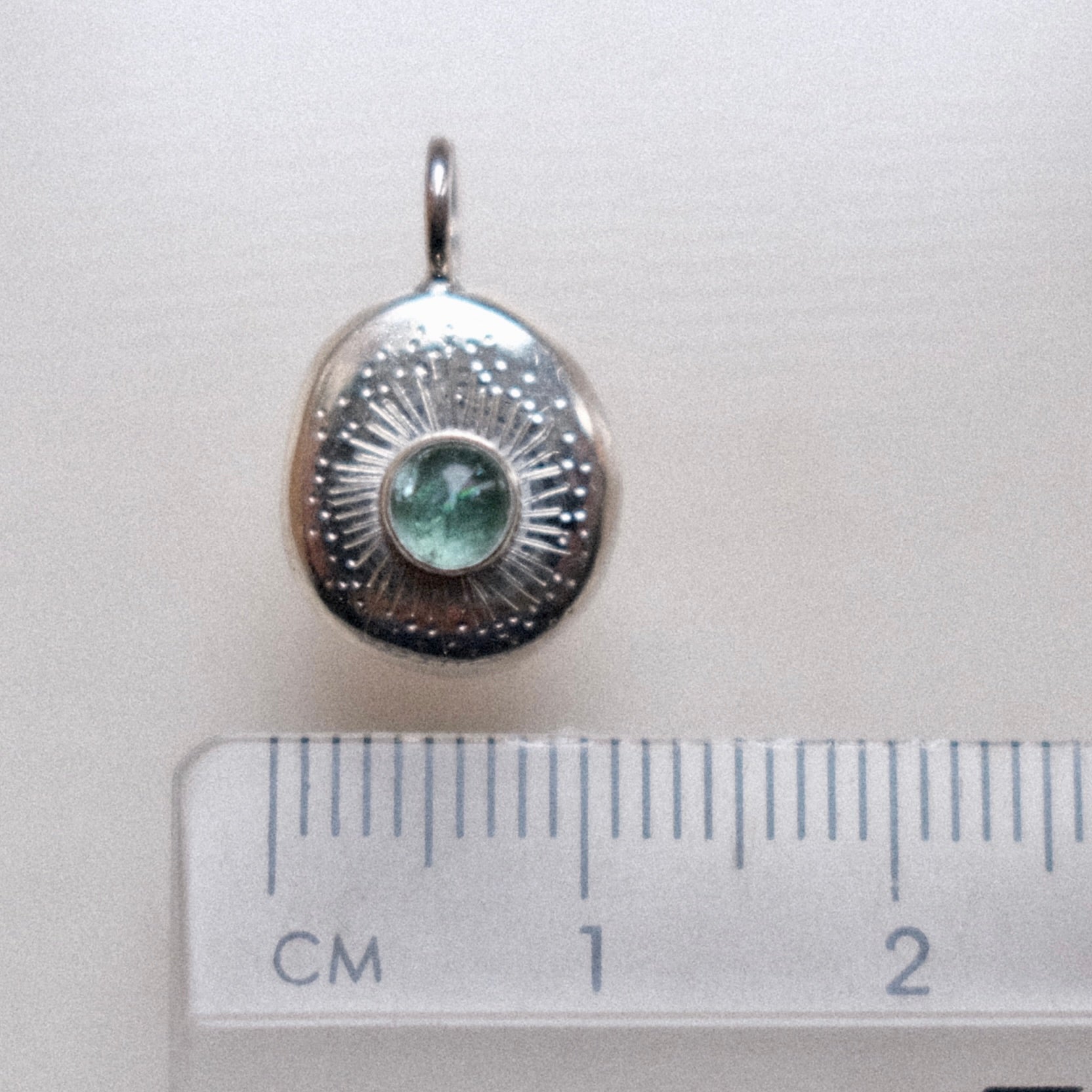 This handmade solid sterling silver pendant features a 4mm Brazillian Tourmaline Cabochon and engraved starburst pattern.