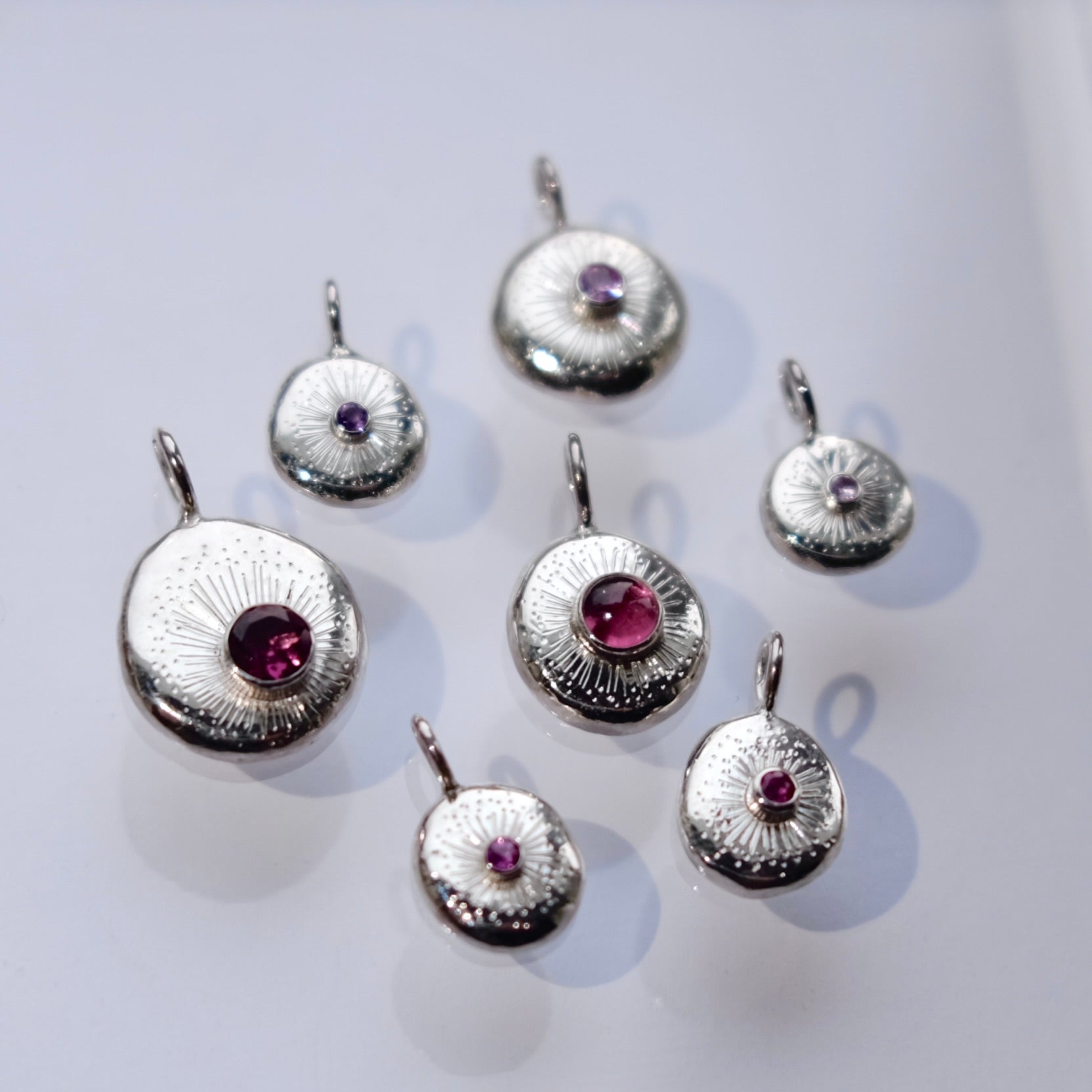 This handmade solid sterling silver pendant features a 5mm Rhodolite Garnet Facet and engraved starburst pattern.