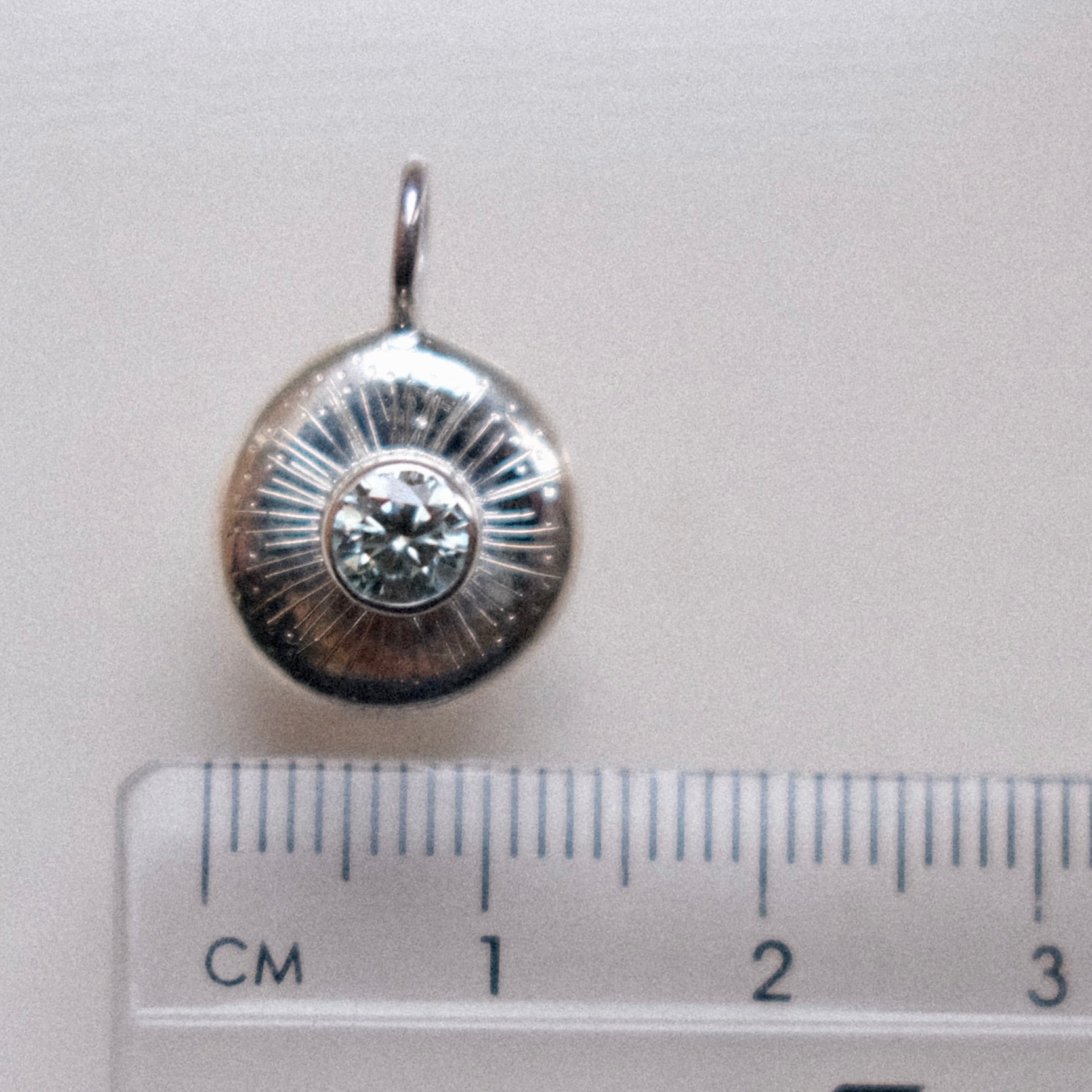 This handmade solid sterling silver pendant features a 5mm Teal Moissanite and engraved starburst pattern.