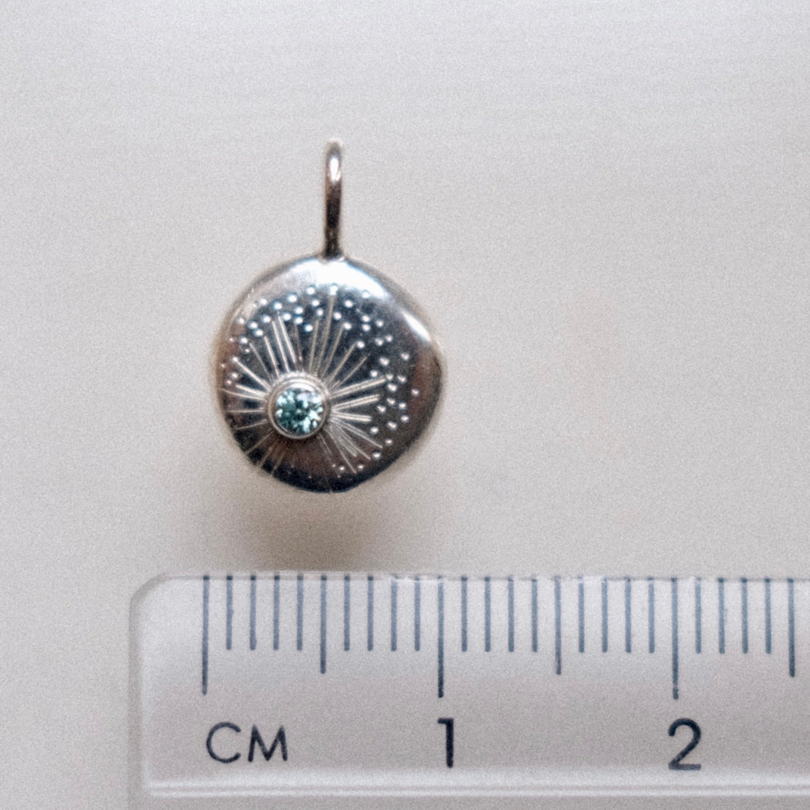 This handmade solid sterling silver pendant features a 2mm Teal Moissanite and engraved starburst pattern.
